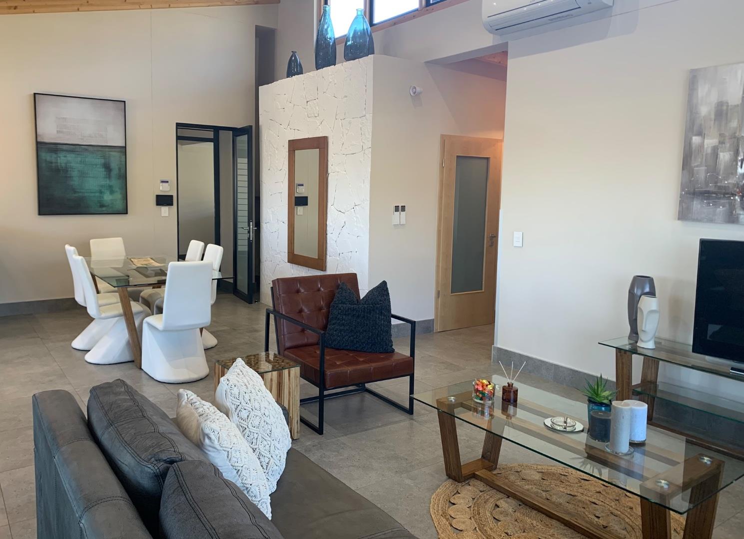 Step into a bright and airy open-plan living space, beautifully finished with tiled floors and accented by modern rugs. Enjoy breathtaking views and stunning sunsets from the balconies and most windows. The living room features two air conditioners, with an additional unit in the main bedroom, creating a comfortable environment year-round. Positioned high above the ground, you can open doors and windows to invite the refreshing Windhoek breeze.